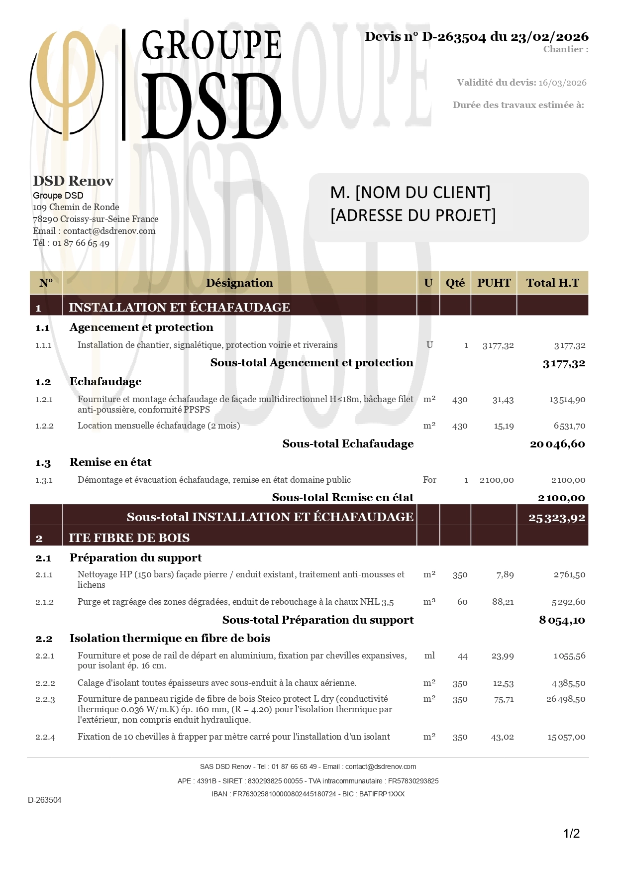 Le devis en question présente un projet d’ITE à la fibre de bois, réalisé sur un immeuble.